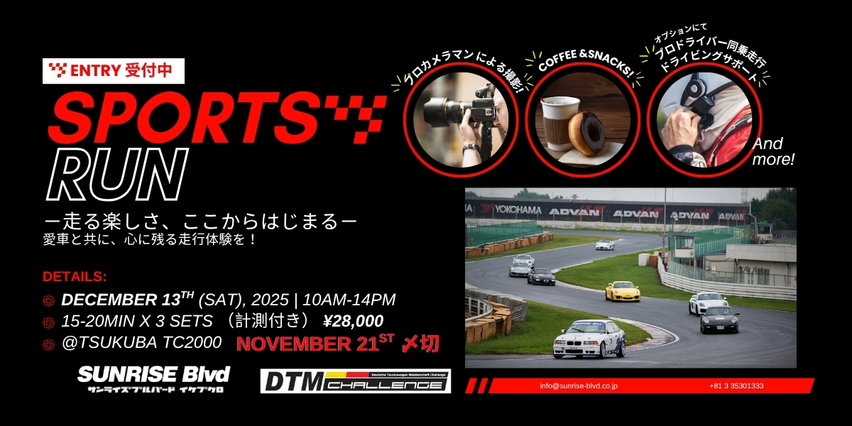 今年最後の走行会の受付をスタートします。場所はホームコースの筑波サーキットTC2000です。 気温も低く人や車にも優しい時期です。今回も安心して思いっきり走れるようにTIMEよる クラス分けを行い、各クラスMAX20台で走り易さを重視しております。 皆さまとサーキットでお会いできる事も楽しみにしております。是非、お友達をお誘い合わせの上 沢山のエントリーお待ちしております。 初めての方も安心できるレクチャー付き。 プロカメラマン撮影も実施予定です。 ギャラリーの方も気軽にお越しください。 今回は人数限定のオプションにて、プロドライバーによる ドラサポ(同乗走行、ロガー解析、映像診断などを 行います。興味のある方はお早めにご相談下さい。 開催日:2025年12月13日(土) 時間:10:00~14:00 走行枠: 15~20分 x3セット タイム計測付 プロカメラマンによる撮影付 参加費用:¥28.000(税込) 早割は¥2.000引き 10月31日(金)まで 締切:11月21日(金)まで 締切後のエントリーは+¥5.000アップ 12月5日以降は更に+¥5.000アップ。 締切後のエントリーはエントリーリスト及びリザルトに名前が反映されない場合がございます。 注意事項 エントラントの都合により参加出来なくなった場合、 エントリー費の返金及び代理エントリーは受付出来ません。 あらかじめご了承下さい。 |