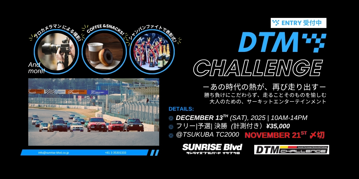 2025年12月13日(土) DTM Challenge 開催! 1984年〜1996年にわたって数々の名勝負を生んだドイツツーリングカー選手権(DTM)。 その雰囲気とスピリットを筑波で再び感じる、特別なレースイベント。 このイベントは「速さを競う」だけではなく、 ドライバー同士がフェアに走る喜び、クルマを操る楽しさを共有することを大切にしています。 AT車も可。クラシック車両も歓迎。初参加の方でもDTMのレギュレーションに合っていればOKです! ぜひご挑戦ください。沢山のエントリーをお待ちしております。 開催日:2025年12月13日(土) 時間:10:00~14:00 フリー走行、予選、決勝 表彰あり #プロカメラマンによる撮影付 参加費用:¥35.000(税込) 早割は¥2.000引き 10月31日(金)まで 締切:11月21日(金)まで 締切後のエントリーは+¥5.000アップ 12月5日以降は更に+¥5.000アップ。 締切後のエントリーはエントリーリスト及びリザルトに名前が反映されない場合がございます。 DTM Challengeのレギュレーションはこちら(リンク)https://sunrise-blvd.co.jp/dtm%e3%83%81%e3%83%a3%e3%83%ac%e3%83%b3%e3%82%b8-regulations/ 注意事項 エントラントの都合により参加出来なくなった場合、 エントリー費の返金及び代理エントリーは受付出来ません。 あらかじめご了承下さい。 |