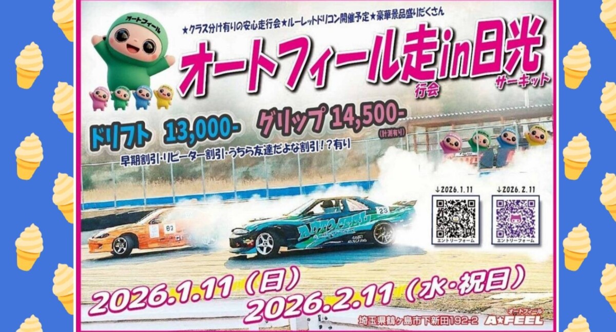 毎年恒例! 年始1発目! オートフィール走行会in日光サーキット ~オートサロンもいいけど日光もねっ~ 2026年もやります!日光サーキット走行会!! 安心のクラス分け走行会☆ いっぱい走れる! ドキドキ同乗できる! 豪華?景品盛りだくさん!! あの話題の選手に会えるかも!?!? ドリフトは初級、中級、上級のクラス分け。 グリップは初心者~初中級の練習クラスになります。 初心者さん大歓迎!サーキットデビュー応援します! サポートばっちり!?安心して参加してください☆ 2026も一緒に楽しみましょう v(≧▽≦)v |